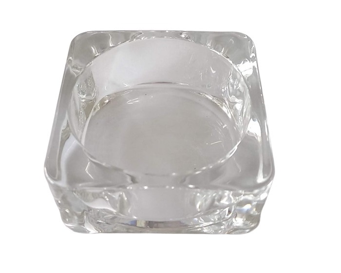 Γυάλινη, τετράγωνη καντηλόκουπα διάφανη. Μήκος 7εκ., πλάτος 7εκ και ύψος 3,5εκ. Διάμετρος μέσης 6εκ.