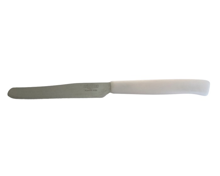 Ανοξείδωτο μαχαίρι με οδοντωτή λάμα και πλαστική λαβή σε λευκό χρώμα. Μήκος λάμας 10,5εκ και συνολικό μήκος 21εκ.