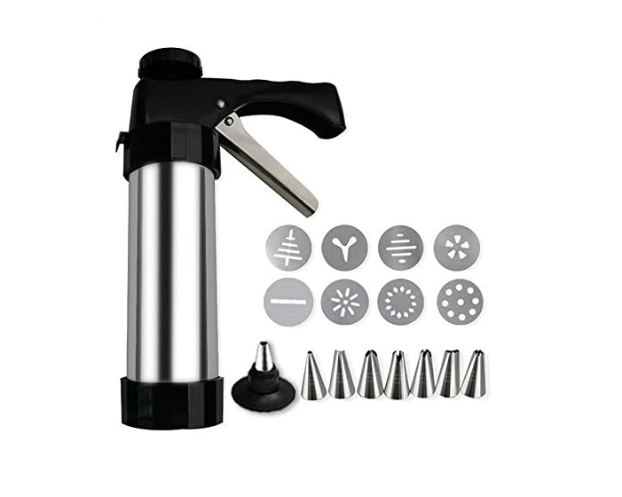 Ανοξείδωτη μπισκοτομηχανή με πλαστικές λεπτομέρειες. Διαθέτει 8 μύτες και 8 δίσκους για διακόσμηση γλυκών και παρασκευή μπισκότων.