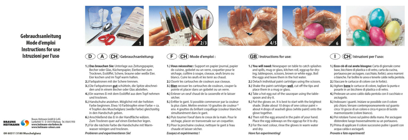 Βαφή αυγών heitmannpearl effects (περλέ) . Το κουτί περιλαμβάνει 5 βαφές σε υγρή μορφή για άμεση χρήση σε χρώματα κίτρινο,κόκκινο,πορτοκαλί,πράσινο και μπλε, ένα ουδέτερο χρώμα(λευκό) που προσδίδει την περλέ - μαρμάρινη όψη και ένα ζευγάρι γάντια. Μη τοξική.