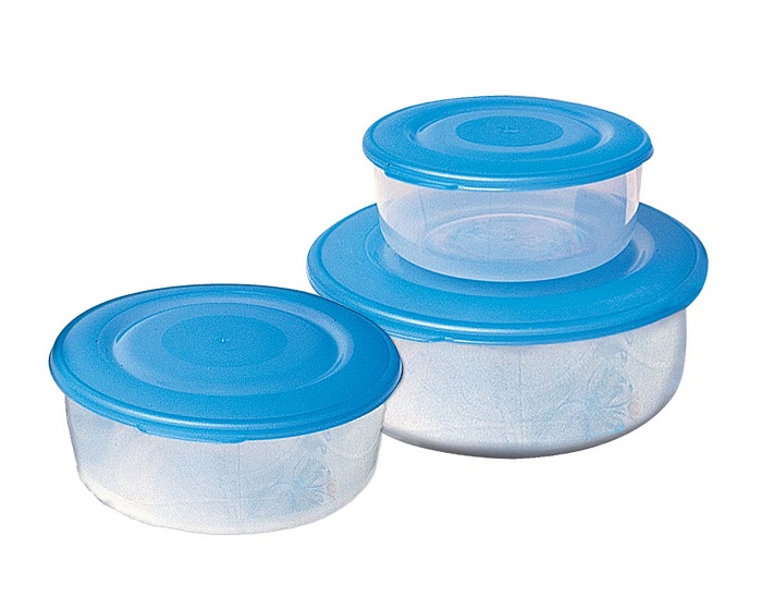 Πλαστικό στρόγγυλο φαγητοδοχείο με καπάκι, σετ 3τμχ. Τοποθετείται το ένα μέσα στο άλλο για εξοικονόμηση χώρου. Χρώματα στο καπάκι ανάλογα με τη διαθεσιμότητα και κατόπιν συννενόησης.Τα μεγέθη είναι 0.5lt(13.5x6) , 1 lt(16.5x7) και 1.7lt(19x8.5). Είναι κατάλληλα για φούρνο μικροκυμάτων χωρίς το καπάκι τους, για κατάψυξη, πλυντήριο πιάτων.