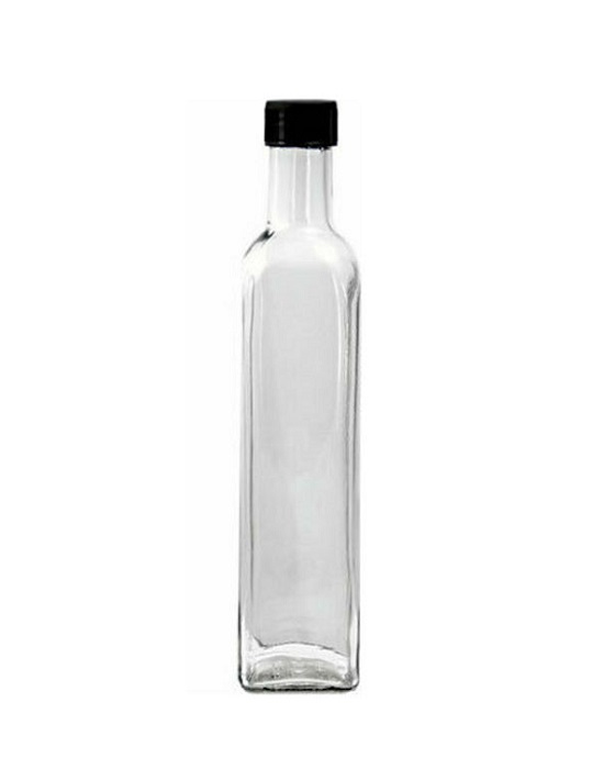 Γυάλινο τετράγωνο μπουκάλι με μαύρο καπάκι, χωρητικότητας 500ml. Ιδανικό για λικέρ, ποτά κτλ.