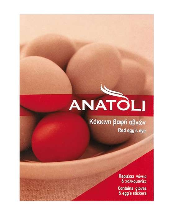 Μη τοξική βαφή αυγών ΑΝΑΤΟΛΗ. Η συσκευασία περιέχει βαφή αυγών για 40 αυγά, χαλκομανίες και γάντια, καθώς και οδηγίες χρήσης για εντυπωσιακά αποτελέσματα.