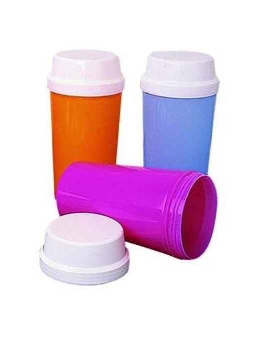 Πλαστικό σέικερ με βιδωτό καπάκι για διάφορα ροφήματα. Χρώματα ανάλογα με την διαθεσιμότητα και κατόπιν συννενόησης.