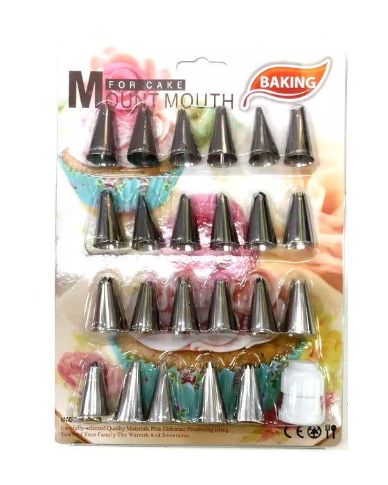 Σετ 23 τεμαχίων ανοξείδωτες μύτες ζαχαροπλαστικής. Το πακέτο διαθέτει πλαστικό βιδωτό εξάρτημα που συγκρατεί τις μύτες για μεγαλύτερη σταθερότητα.